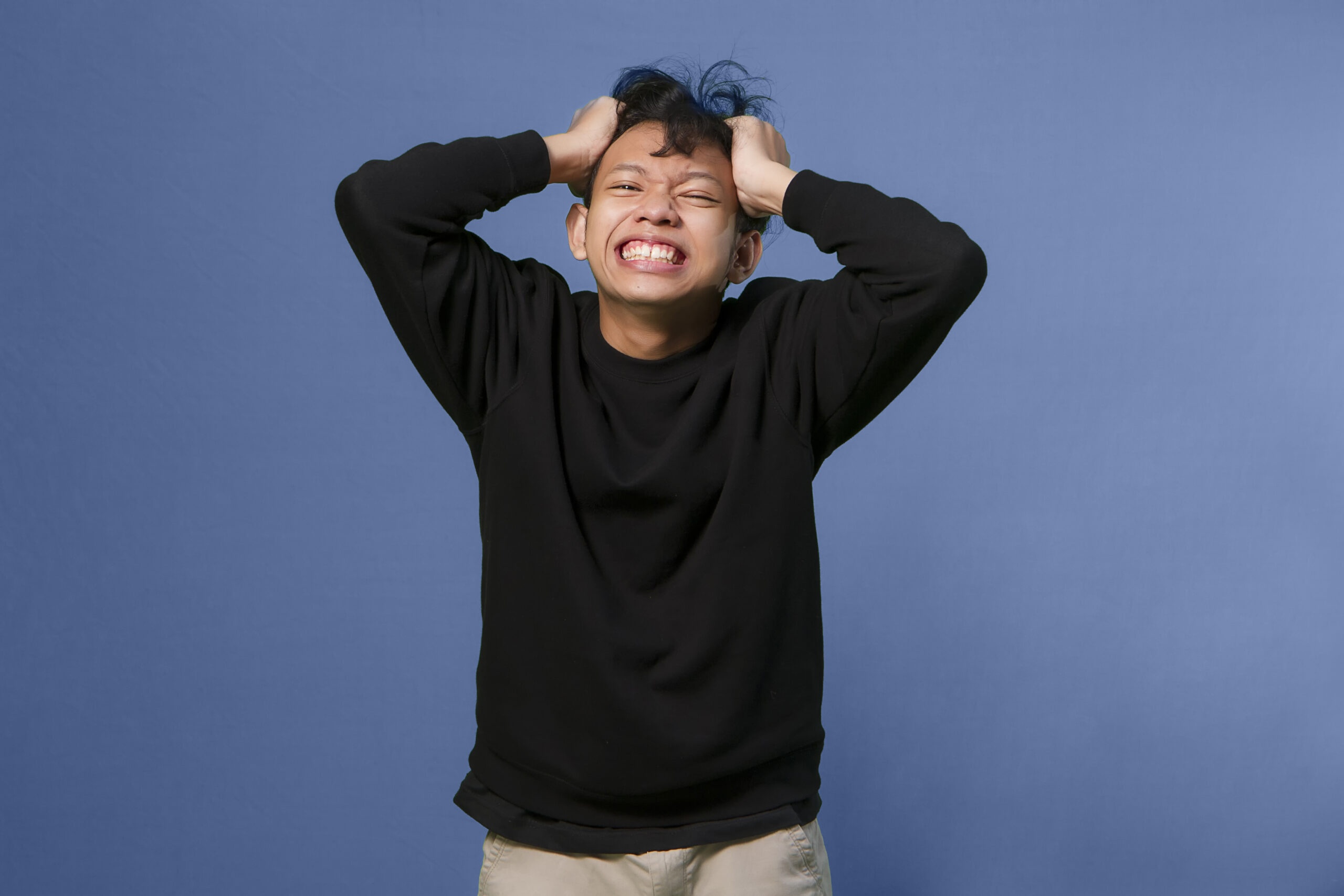 asian man stressed is going crazy pulling his hair in frustratio